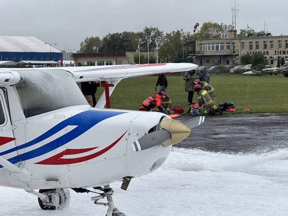 Na sygnał alarmowy natychmiast zareagowały służby. Strażacy błyskawicznie zabezpieczyli miejsce pozorowanej katastrofy, wykorzystując pianę gaśniczą, a następnie wydobyli nieprzytomną załogę samolotu. Równolegle zespoły ratownictwa medycznego udzieliły pierwszej pomocy i przetransportowały „poszkodowanych" do szpitala. Teren lotniska został zabezpieczony przez policję, a operacje lotnicze wstrzymano na czas akcji ratowniczej, zgodnie z wydanym NOTAM-em – oficjalnym ostrzeżeniem dla ruchu lotniczego.