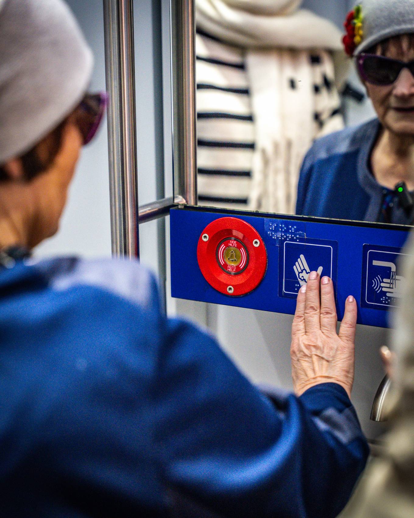 • kontrastowe oznaczenia, napisy w alfabecie Braille'a, dźwiękowa sygnalizacja drzwi,
