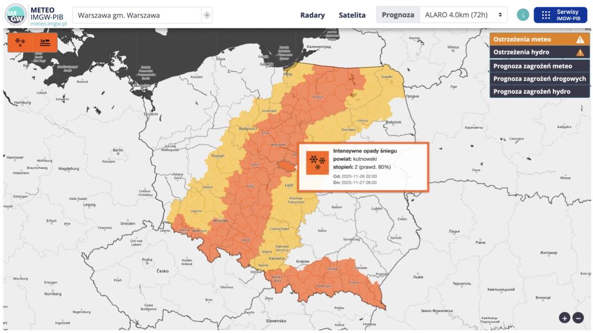 Pierwsze ostrzeżenie, niższego - I stopnia, obowiązuje od godziny 8.00 w środę 26 listopada do północy tego samego dnia. Obejmuje ono m.in. Łódź, Skierniewice, Piotrków Trybunalski oraz powiaty: bełchatowski, brzeziński, łaski, łowicki, łódzki wschodni, opoczyński, pabianicki, pajęczański, piotrkowski, radomszczański, rawski, skierniewicki, tomaszowski, zduńskowolski i zgierski.