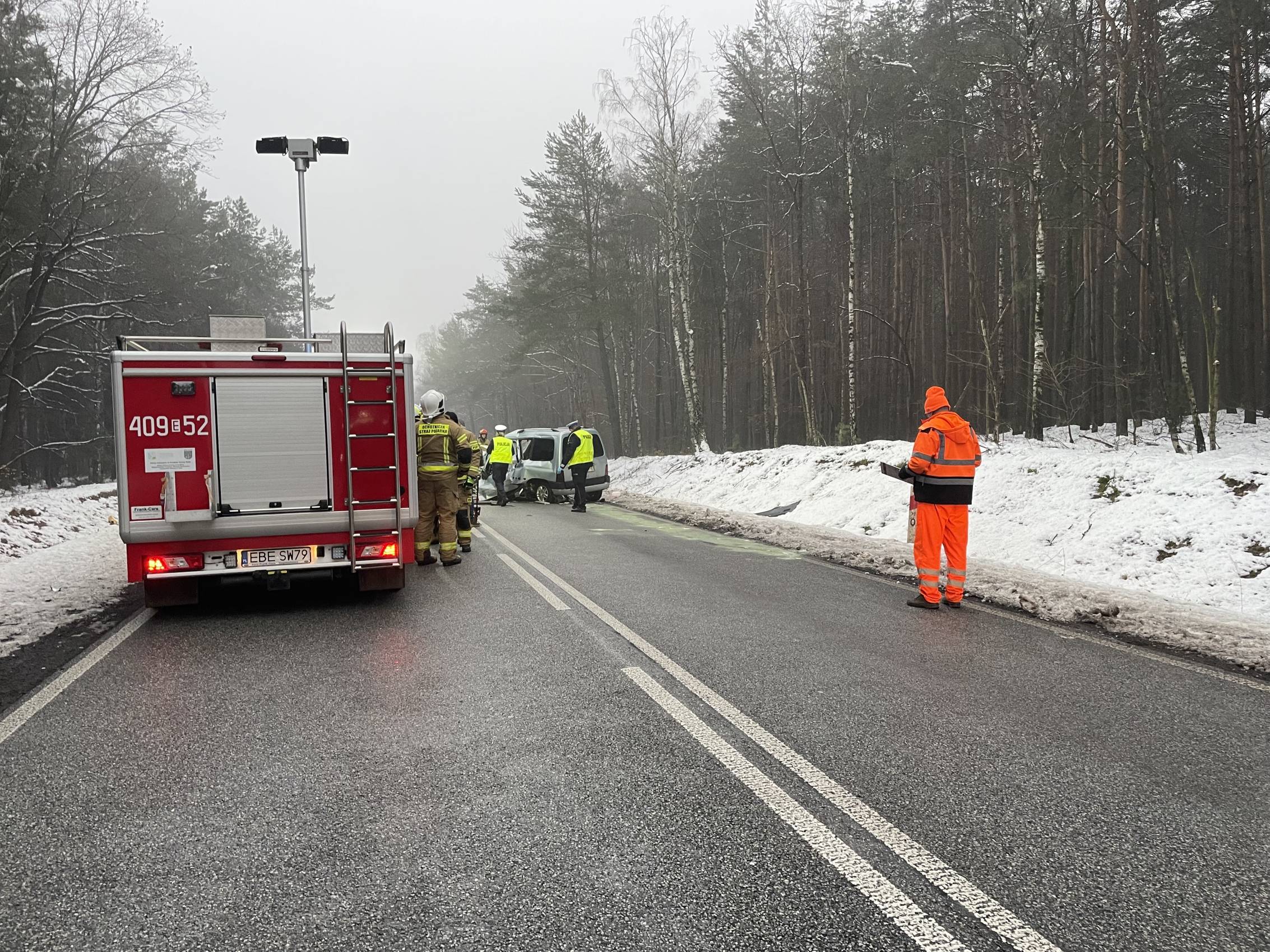 Na miejscu pracują policjanci, strażacy oraz prokurator, którzy ustalają dokładne okoliczności zdarzenia. Droga krajowa pozostaje całkowicie zablokowana, a utrudnienia mogą potrwać jeszcze około dwóch godzin.