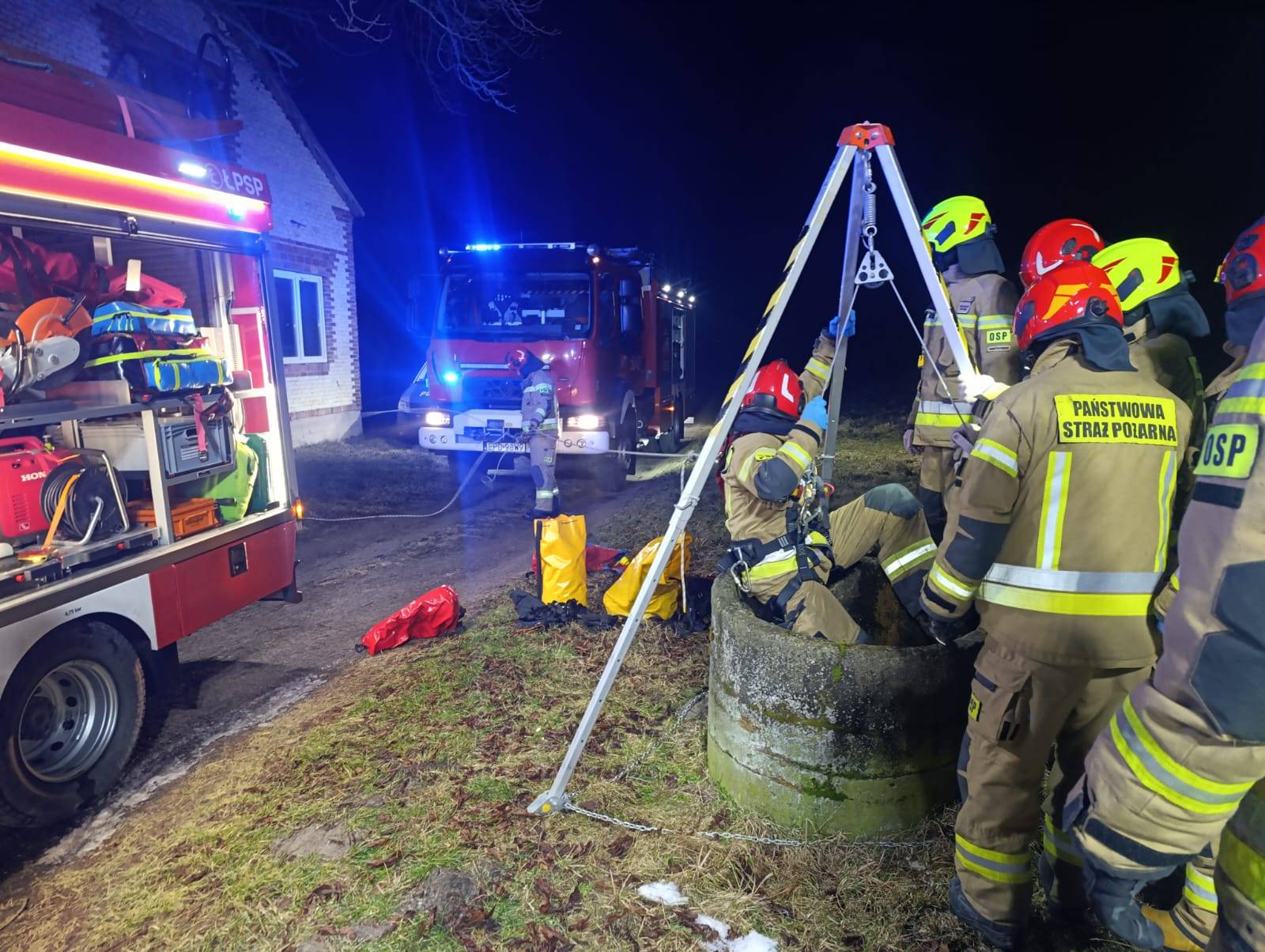 Po dotarciu na miejsce ratownicy zastali osobę znajdującą się w wodzie wewnątrz studni. Strażacy niezwłocznie przystąpili do działań mających na celu dotarcie do poszkodowanego i jego ewakuację na powierzchnię.